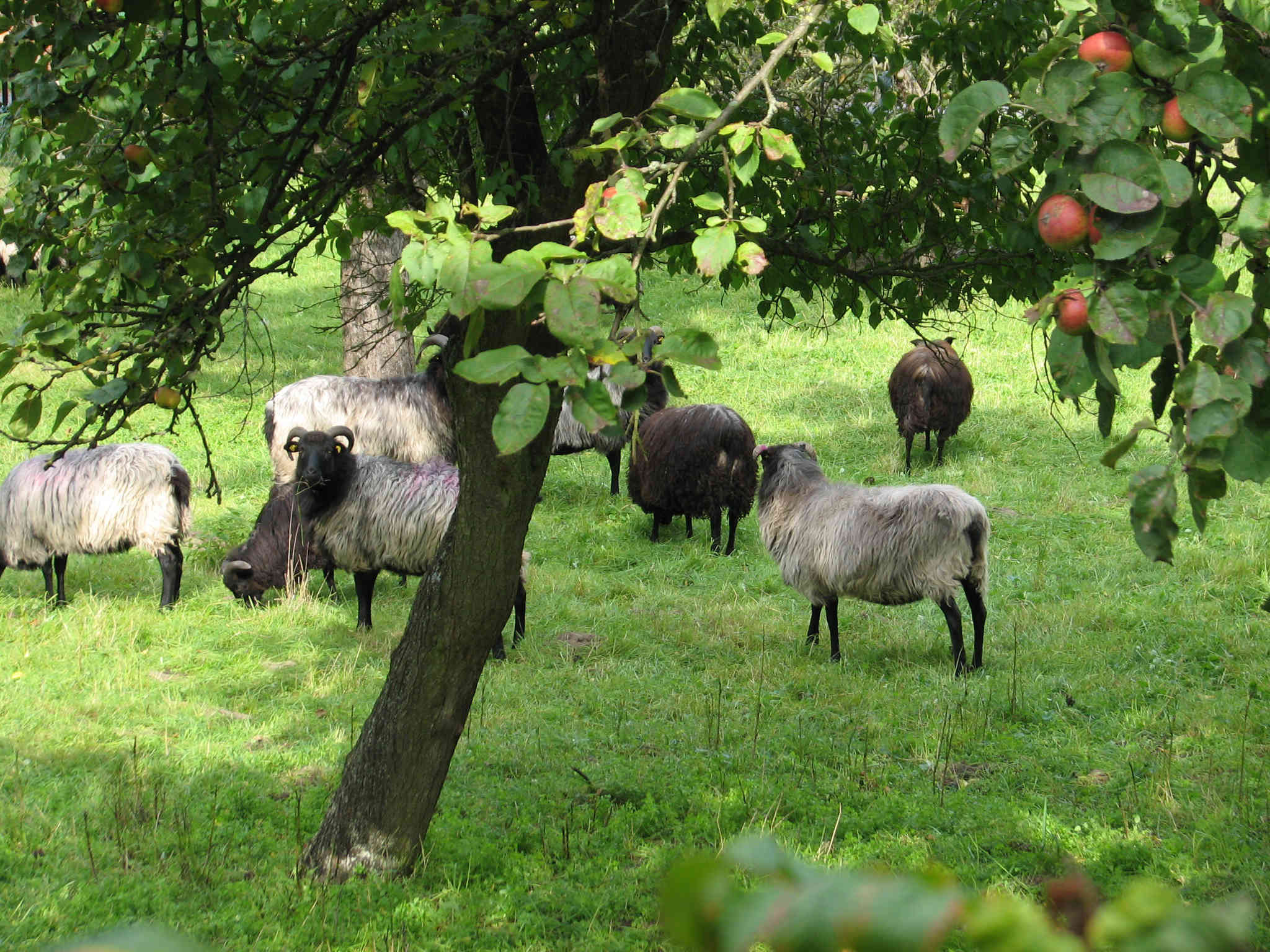 Wenn man Tieren das „Mähen“ der Wiese überlässt, muss die Anzahl der Tiere zur Größe der Wiese passen. Außerdem sollten die Tiere nicht dauerhaft auf der Streuobstwiese weiden. Sonst kann es durch den Tierkot zu einem Überangebot an Nährstoffen kommen.